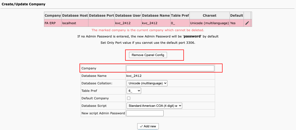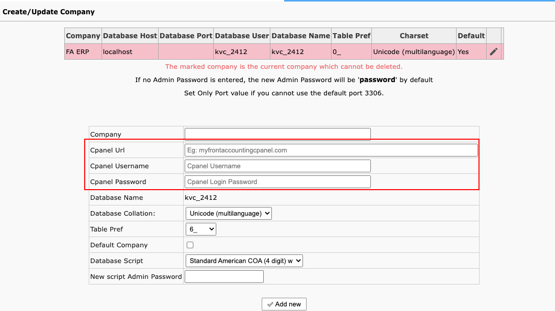 Once you saved the credentials you dont need to feed the database, host, username, password port no for it. It can be automatically fetched and created new company. You can simply input the company name to create it.