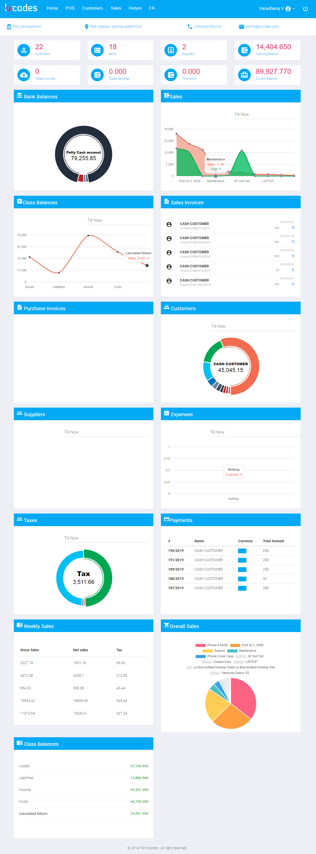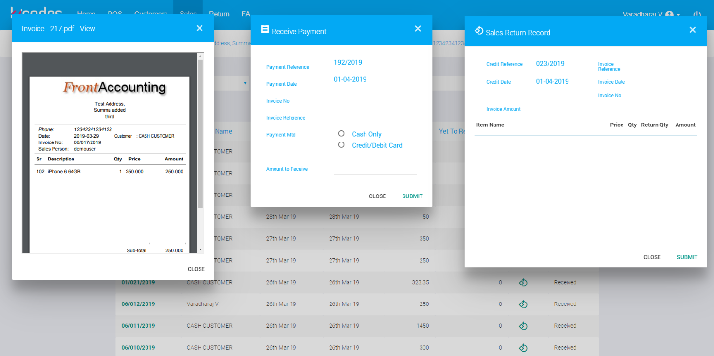 A Simple and Liteweight POS module for FrontAccounting(FA).Point of Sale is widely used and many super markets and stores has the functionality to sell the items from their store. We know that FrontAccounting is good standard framework for Accounting software. And we can create a module to have POS part alone. which will help you to handle sales from different terminals. But all of your sales can be stored in one FA. Most of the functionalities available within FA itself. But the terminal part, I have programmed to use it in separate module, Actually its not just a module. Its separate another Framework to work on POS point. So the FrontAccounting POS Module is just another framework.